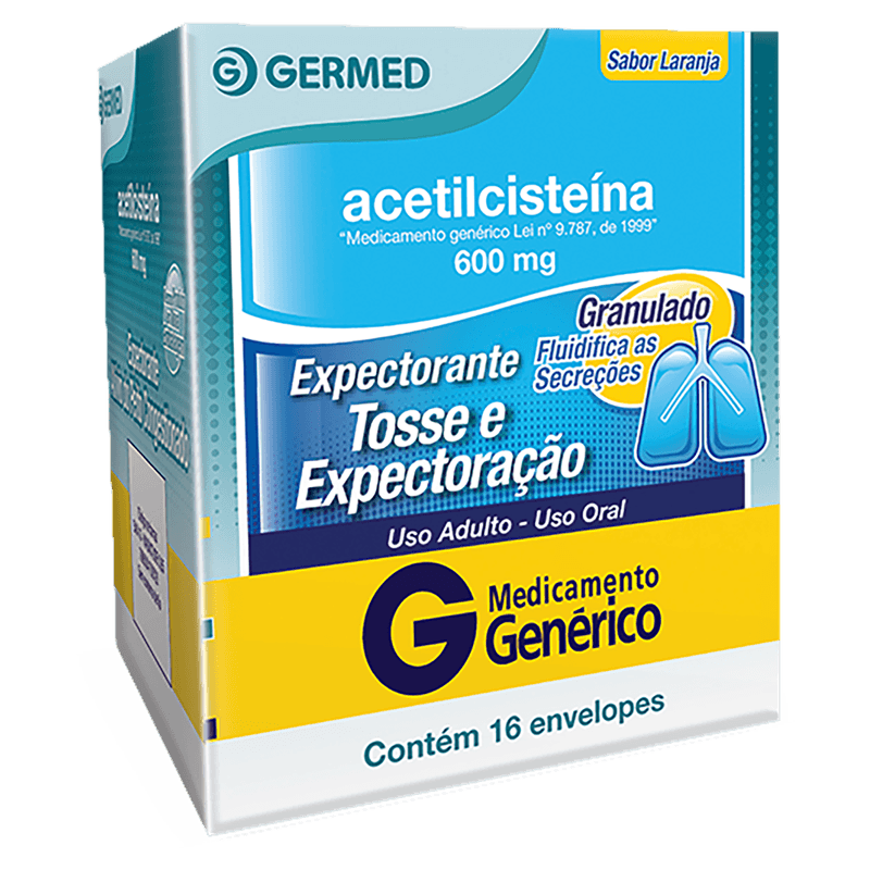 Cada envelope contém 600mg de acetilcisteína em granulado sabor laranja, facilitando a administração oral. O produto atua diretamente nas vias respiratórias, despolimerizando mucoproteínas e ácidos nucléicos, além de exercer ação antioxidante, contribuindo para a defesa celular. A embalagem contém 16 envelopes, ideal para um tratamento completo. Este medicamento é de tarja vermelha, vendido sob prescrição médica, e indicado para adultos e crianças acima de 2 anos que necessitam de expectoração facilitada.