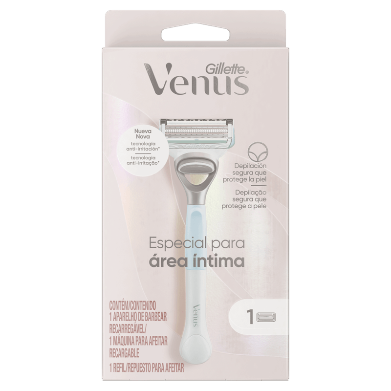 A nova Gillette Venus Recarregável para Área Íntima foi criada especialmente para proteger a pele sensível da virilha, ajudando a prevenir irritações e pelos encravados.