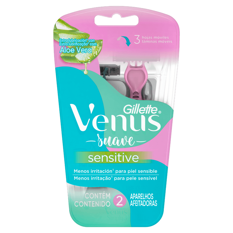 Os aparelhos de depilação descartáveis Venus Suave Sensitive possuem fita lubrificante com tecnologia Skin Elixir para facilitar o deslizamento e ajudá-la a ter uma depilação suave com menos irritação* (vs. Prestobarba2), ideal para peles sensíveis. Sua cabeça móvel se ajusta a suas curvas e suas três lâminas proporcionarão uma depilação rente e maciez por mais tempo* (vs. Prestobarba2). Venus Suave Sensitive é dermatologicamente testada para peles sensíveis. Para uma experiência incrível, use o Gel para Depilação Gillette SatinCare.