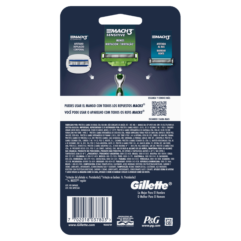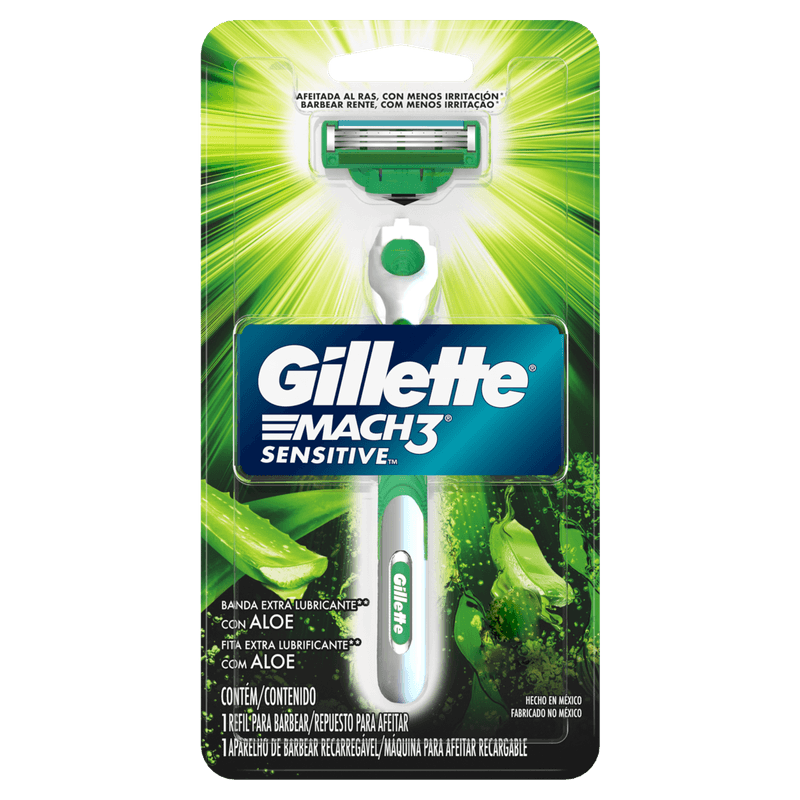 "Além das características da família Mach3 nas quais você já confia, a lâmina de barbear Mach3 Sensitive oferece uma fita lubrificante avançada* com a Tecnãologia Skin Protect que protege contra irritação, mesmo em pele sensível. Para melhor performance, use em um aparelho Mach3 Sensitive.