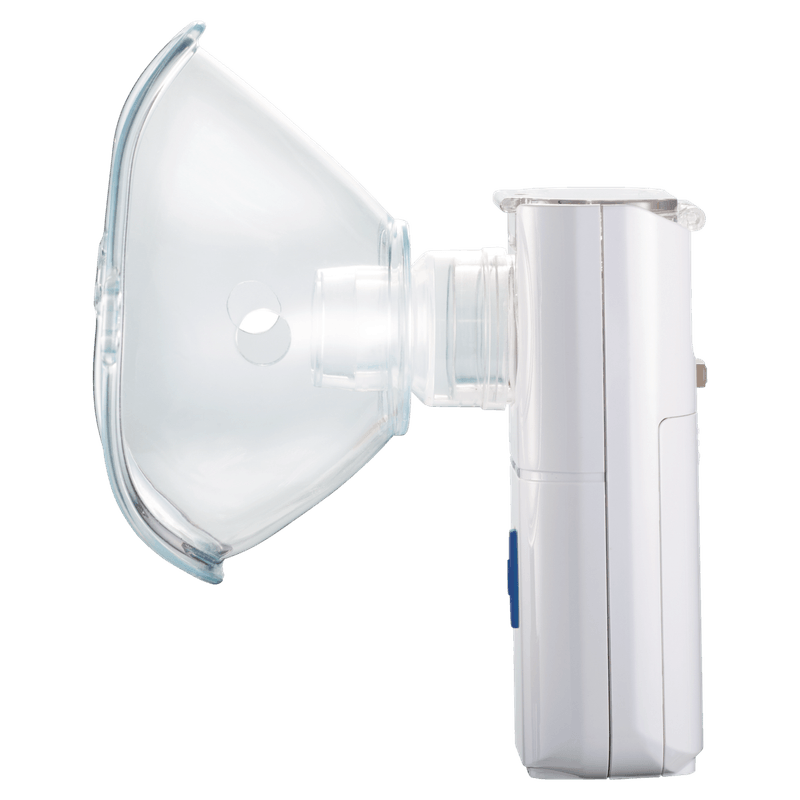 Funciona com pilhas (até 2,5h de autonomia) ou por cabo USB. O sistema Mesh é compatível com corticoides e permite nebulização mesmo deitado. Acompanha duas máscaras macias para adultos e crianças, com ajuste confortável.