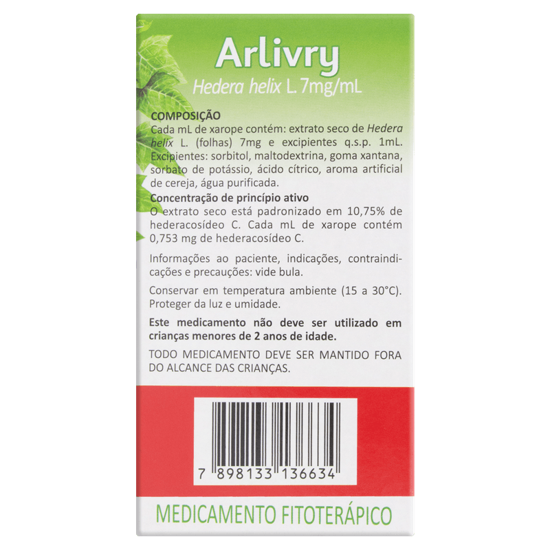 Arlivry é contraindicado para pessoas com hipersensibilidade aos componentes da fórmula ou a plantas da família Araliaceae, crianças menores de 2 anos, gestantes e lactantes devido à falta de dados de segurança. O produto possui sabor cereja, apresentação em xarope com 100 mL, e é classificado com tarja vermelha, sendo vendido sob prescrição médica com retenção de receita.