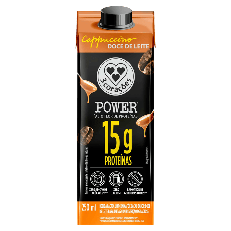 O 3 Corações Power Bebida Láctea Cappuccino Doce de Leite é uma opção nutritiva e prática para quem busca suplementação proteica sem lactose. Com 15g de proteínas por embalagem de 250ml, zero lactose, sem glúten e sem adição de açúcares, oferece sabor cremoso e equilibrado, ideal para consumo no pré ou pós-treino, ou entre as refeições. Desenvolvido para adultos com restrição à lactose e praticantes de atividades físicas, alia sabor e funcionalidade em uma bebida láctea UHT pronta para consumo.