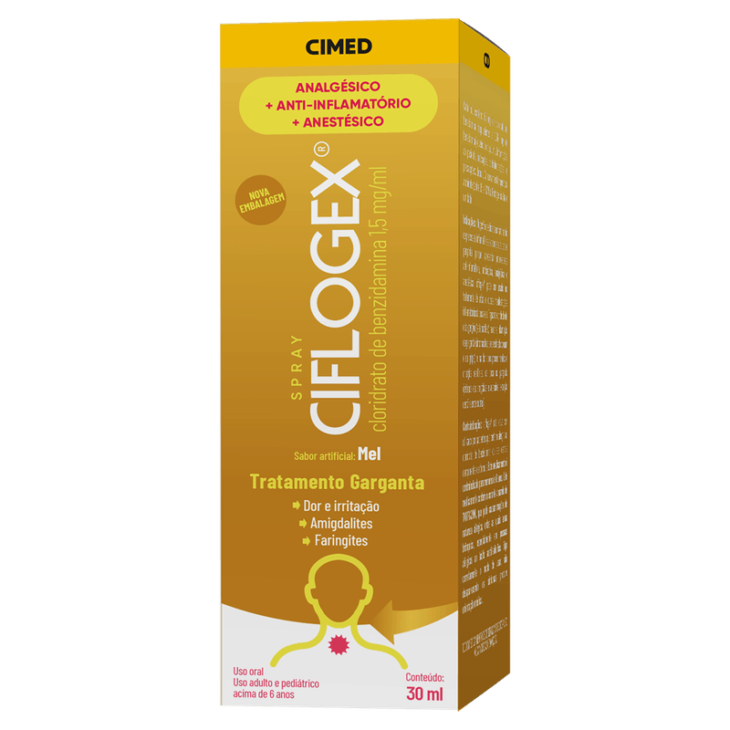 O Ciflogex 1,5mg/ml Mel Caixa 30ml Spray é um medicamento indicado para o alívio rápido de inflamações e dores na boca e garganta, como aftas, estomatites, dores gengivais, amigdalites e faringites. Sua fórmula contém cloridrato de benzidamina, que atua como anti-inflamatório, analgésico, anestésico local e antisséptico, proporcionando redução da vermelhidão, inchaço e dor com efeito anestésico em cerca de cinco minutos. Ideal para adultos e crianças a partir de 6 anos, é uma solução prática em spray com sabor mel, facilitando a aplicação e o conforto no uso.