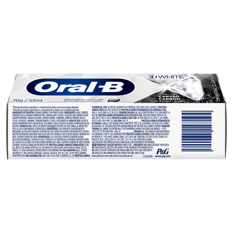 A Oral-B 3D White Mineral Clean é uma pasta de dente enriquecida com flúor que limpa profundamente os dentes, removendo manchas superficiais e promovendo ação clareadora.
