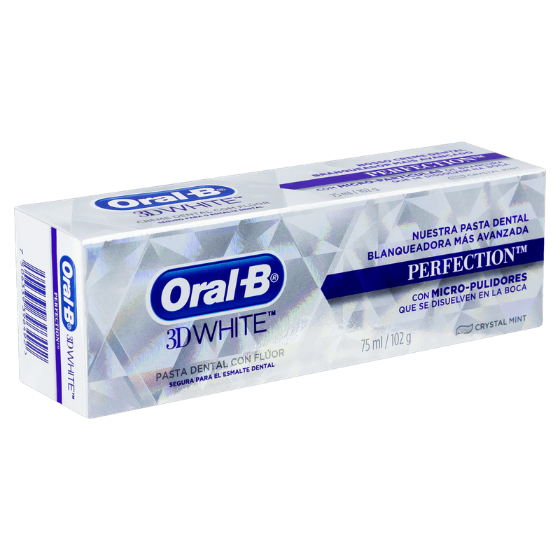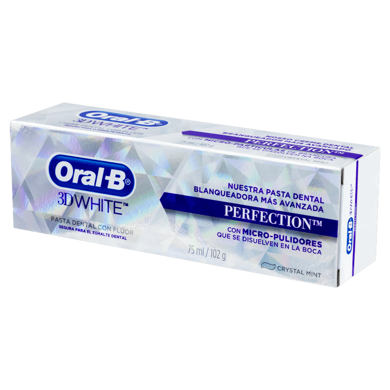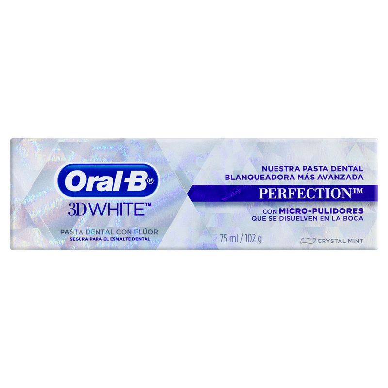 A Pasta de Dente Oral-B 3D White Perfection 102g com sabor Crystal Mint é um creme dental desenvolvido para branqueamento dental, remoção de manchas, prevenção de cáries, controle da placa bacteriana e frescor do hálito.