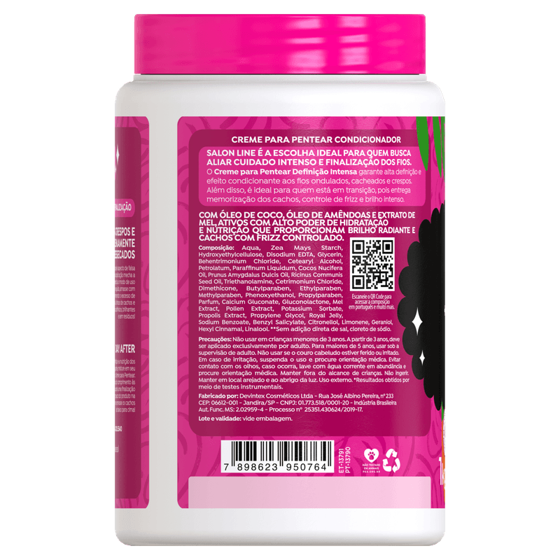 O Creme para Pentear Salon Line Definição Intensa ajuda na definição e memorização dos cachos e no controle de frizz. Sua fórmula proporciona muita hidratação e brilho intenso através de ingredientes incríveis como Óleo de Coco, Óleo de Amêndoas e Mel.