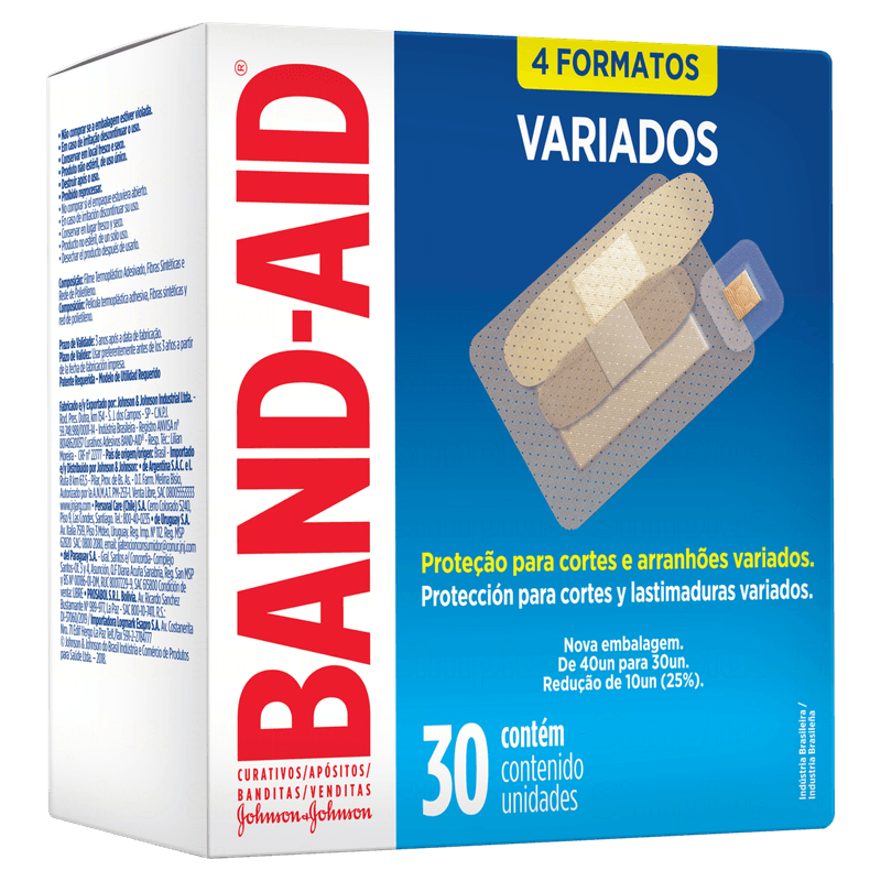 O Curativo Adesivo Variados Band-Aid é um conjunto de curativos adesivos descartáveis, apresentados em diferentes tamanhos e formatos, com tira microporosa hipoalergênica. Sua principal finalidade é a proteção de pequenos cortes, arranhões e ferimentos, prevenindo a contaminação e facilitando a cicatrização.