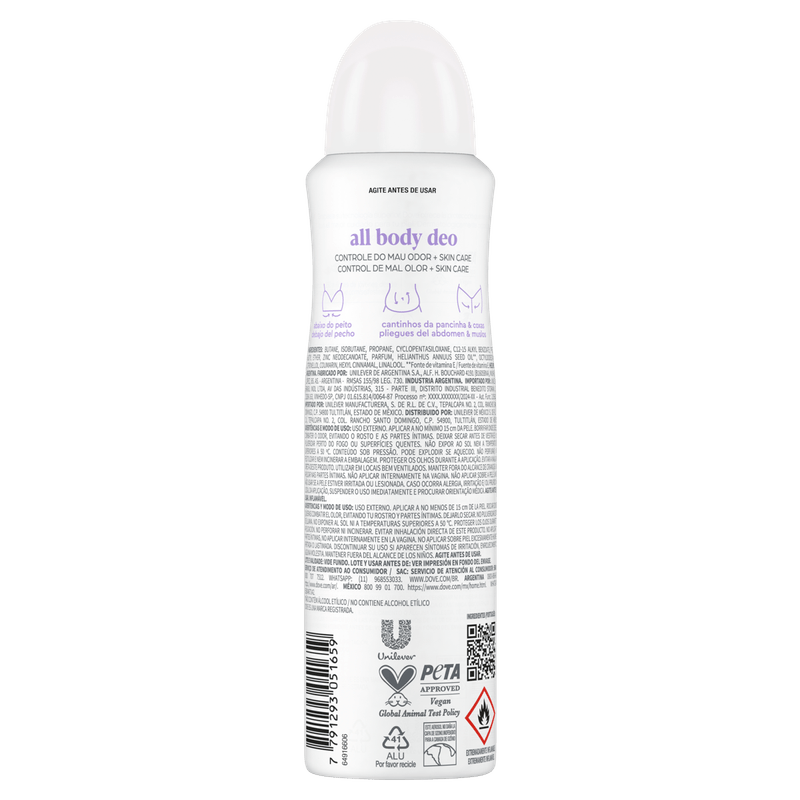 Desodorante aerossol Dove All Body com lavanda e camomila. Proteção prolongada, toque suave e fragrância calmante para todo o corpo.
