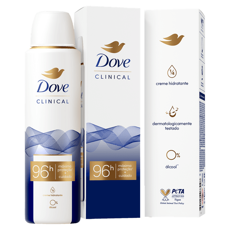 • O Desodorante Antitranspirante Dove Clinical Original Clean garante máxima eficácia contra transpiração • Este antitranspirante Dove garante proteção contra o suor excessivo e mau odor por até 96h, dando uma sensação de limpeza e frescor • Dove Clinical contém 1/4 de creme hidratante, para axilas ainda mais suaves, macias e com máxima proteção* contra o suor excessivo • Este desodorante aerosol é de rápida absorção e delicado para suas axilas • Além de proteger contra o suor e mau odor, este antitranspirante possui uma fragrância delicada Original Clean, a combinação perfeita de proteção, beleza e cuidado • Os desodorantes Dove são certificados como Cruelty-Free pela PETA, pois não realizam e nem realizarão testes em animais O Desodorante Antitranspirante Dove Clinical Original Clean cuida e protege as axilas por 96 horas contra suor e mau odor, mantendo as axilas secas o dia todo. Formulado com 1/4 de creme hidratante, este antitranspirante ajuda a manter a hidratação da pele das axilas, deixando-as suaves e macias. O desodorante Dove Original Clean oferece máxima proteção* contra o suor excessivo. Este desodorante aerosol, além de proteger contra suor e mau odor, possui uma fragrância delicada Original Clean, para uma sensação de limpeza e frescor. O desodorante Dove Original Clean é a combinação perfeita de proteção, beleza e cuidado. Dove proporciona proteção eficaz e cuidado para a pele das axilas, para que você possa se libertar de qualquer desconforto e se sentir confiante o dia todo. Para uma melhor proteção contra marcas de suor e irritação da pele siga estas dicas: após o banho, garanta que as axilas estejam bem secas; para obter o máximo do seu Desodorante Antitranspirante Aerosol Dove Clinical Original Clean agite a embalagem para ativar os ingredientes; segure-a voltada para cima a 15 cm das suas axilas e aplique um jato de dois segundos em cada uma. Dove é certificada Cruelty-Free pela PETA, sendo assim, não realizamos e nem realizaremos testes em animais em nenhum lugar do mundo. *Maior proteção contra transpiração oferecida por Dove.