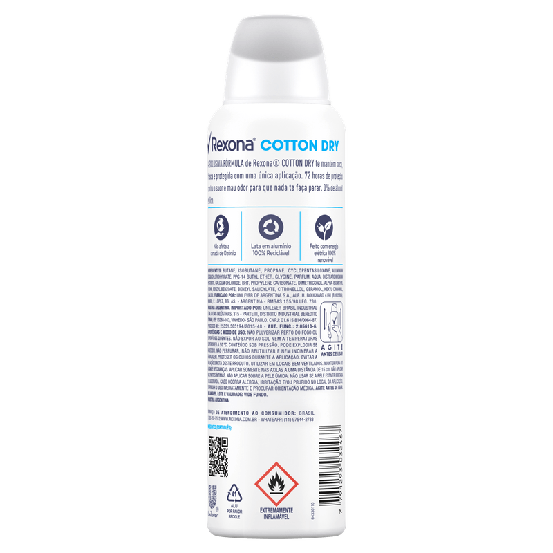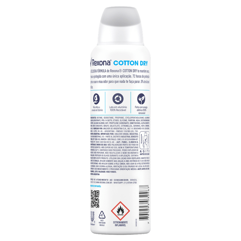 • A exclusiva fórmula do Desodorante Aerosol Feminino Rexona Cotton Dry garante 72 horas de proteção contra o suor e o mau odor ativado pelo movimento • O desodorante antitranspirante aerosol Cotton Dry a mantém seca, refrescada, protegida e confiante para encarar qualquer situação • Desodorante feminino fácil de usar: agite e aplique nas axilas a não menos de 15 cm da pele • A fragrância desse antitranspirante contém uma rica combinação de notas verdes e florais, garantindo a sensação de frescor durante o dia inteiro. • Esse desodorante antibacteriano não contém álcool* e não afeta a camada de Ozônio, sua lata é de alumínio 100% reciclável, feito com energia elétrica 100% renovável • O Desodorante Aerosol Feminino Rexona Cotton Dry permite que você fique sempre protegida, não importa o que aconteça. Rexona não te abandona Mais uma vez Rexona se supera e relança sua linha de desodorantes com uma fórmula inovadora, o Desodorante Aerosol Feminino Rexona Cotton Dry combina um novo e exclusivo ativo antitranspirante com a tecnologia de fragrâncias encapsuladas. Esse desodorante antitranspirante aerosol a mantém protegida por até 72 horas, ativado pelo seu movimento e a deixa muito mais confiante para você encarar qualquer desafio. Com o registro de 16 patentes e mais de 300 testes técnicos, está comprovado que essa nova tecnologia antitranspirante entrega um nível de proteção contra o suor como nenhuma outra proposta regular já entregou antes. A nova e exclusiva fórmula de Rexona Cotton Dry trabalha com um sistema de partículas menores e mais estáveis que formam uma barreira protetora mais resistente e duradoura contra a transpiração e o mau odor, mantendo você seca, refrescada e protegida a cada novo movimento e por muito mais tempo. Sua fragrância contém uma rica combinação de notas verdes e florais, garantindo a sensação de frescor durante o dia inteiro. A lata usada no desodorante é feita de alumínio 100% reciclável, e o produto é feito com energia elétrica 100% renovável, não contém álcool* e não afeta a camada de ozônio. Experimente também outros produtos da linha de desodorantes aerosol femininos Rexona e se sinta sempre protegida durante qualquer atividade. Por que Rexona não te abandona! *Não contém álcool etílico