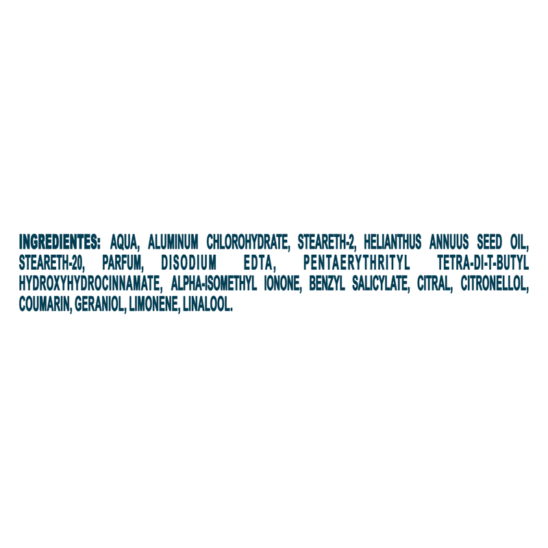 Composição: Aqua, cloro-hidrato de alumínio, estearme-2, óleo de semente de helianthus annuus, estearate-20, parfum, edta dissódico, pentaeritritil tetra-di-t-butilhidrocinnamato, alfa-isometil ionona, salicilato de benzila, citral, citronelol, cumarina, geraniol, limoneno, linalol.