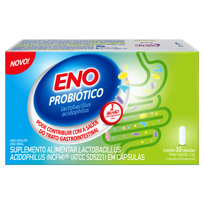 Composto por Lactobacillus acidophilus (NCFM) (ATCC SD5221), celulose microcristalina, dióxido de silício e estearato de magnésio, o Eno Probiótico não contém glúten e é apresentado em cápsulas de 1,5 g (peso líquido), sem sabor especificado. Este suplemento oral, sem necessidade de prescrição, é indicado para quem deseja restaurar as boas bactérias do organismo e melhorar a saúde gastrointestinal de forma prática e segura.