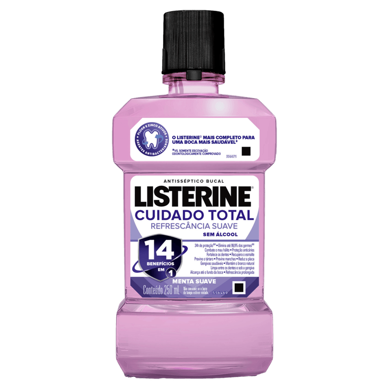O enxaguante bucal Listerine Cuidado Total conta com seus 6 benefícios que auxiliam em uma boca mais saudável em poucas semanas. Atua na prevenção das cáries, fortalece o esmalte, previne a placa bacteriana, reduz a formação de tártaro, mantém as gengivas saudáveis e o hálito fresco. Previne as cáries, fortalece o esmalte, previne a placa bacteriana, reduz a formação do tártaro, gengivas mais saudáveis e hálito frescoIdeal para a limpeza de regiões em que a escova e o fio dental não alcançam. Boca mais saudável em 2 semanas. Sabor menta fresca