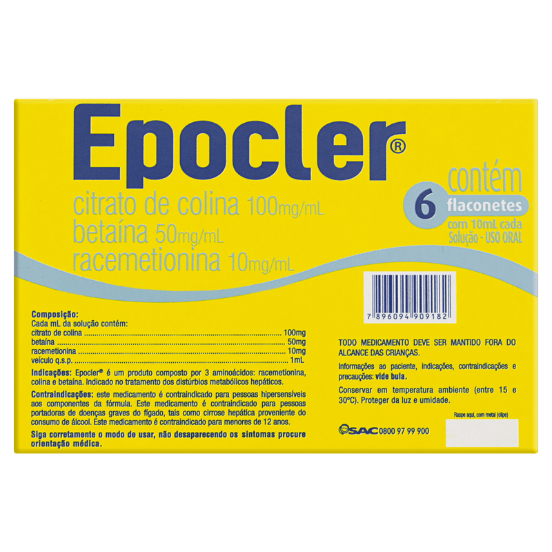 Cada flaconete contém uma solução oral com 100 mg/mL de citrato de colina, 50 mg/mL de betaína e 10 mg/mL de racemetionina, garantindo uma composição balanceada para o suporte hepático. O produto é vendido sob prescrição médica e apresentado em embalagem com 6 flaconetes de 10 ml cada, com textura líquida e fácil administração oral. Epocler é indicado para quem busca um cuidado eficaz e seguro para o fígado, promovendo melhor qualidade de vida e bem-estar digestivo.