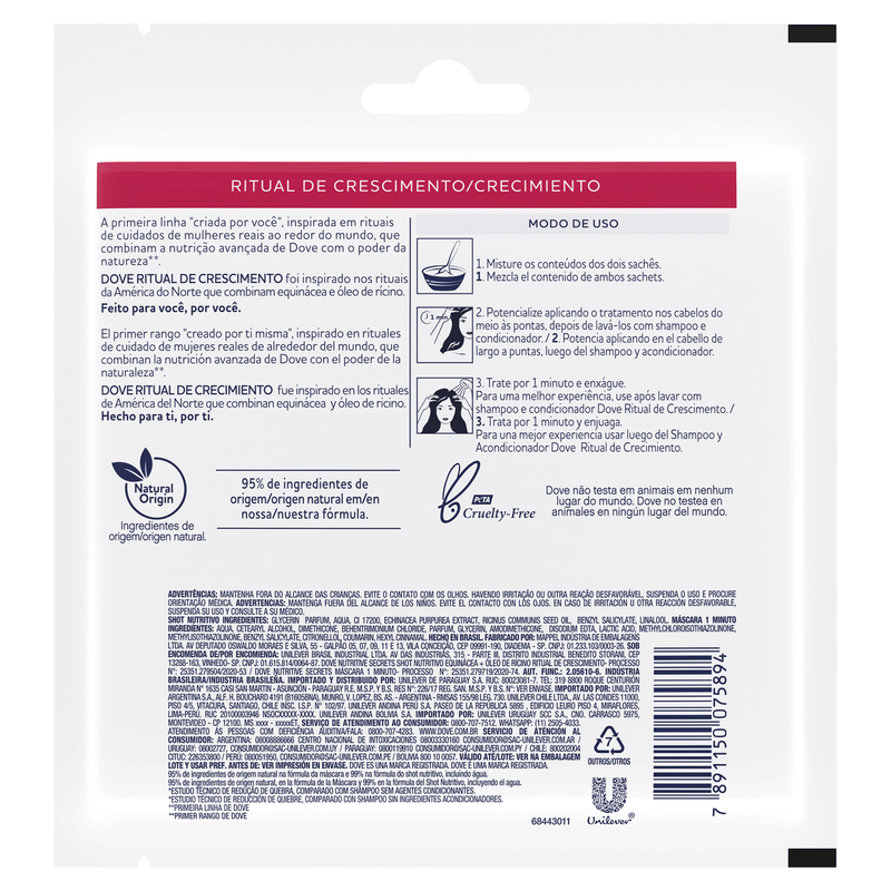 Composição: Shot nutritivo: glycerin, parfum, aqua, CI 17200, echinacea purpurea extract, ricinus communis seed oil, benzyl salicylate, linalool. Máscara 1 minuto: aqua, cetearyl alcohol, dimethicone, behentrimonium chloride, parfum, glycerin, amodimethicone, disodium EDTA, lactic acid, methylchloroisothiazolinone, methylisothiazolinone, benzyl salicylate, citronellol, coumarin, hexyl cinnamal.