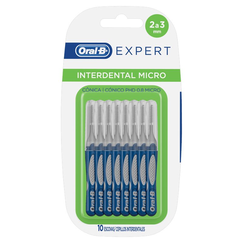 A Escova Interdental Oral-B Expert Micro, com formato cônico de 2 a 3mm, limpa áreas inacessíveis para escovas convencionais. Ideal para aparelhos, pontes, coroas, implantes ou dentes espaçados, remove placa e resíduos, ajudando a combater cáries e mantendo dentes e gengivas saudáveis.