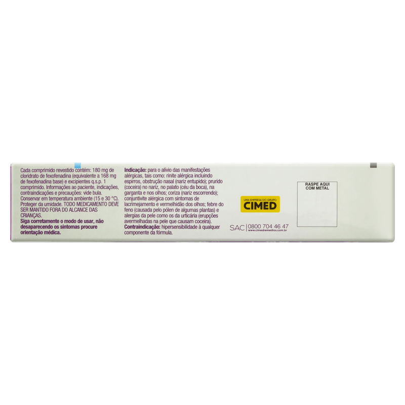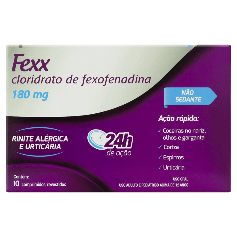 Cada embalagem contém 10 comprimidos revestidos, sem sabor, com ação que dura até 24 horas. O produto possui tarja vermelha, sendo vendido sob prescrição médica. Sua fórmula é composta por 180 mg de cloridrato de fexofenadina e excipientes, indicada para uso oral em pacientes com manifestações alérgicas na pele e mucosas. Fexx oferece alívio rápido e duradouro, contribuindo para melhor qualidade de vida no controle das alergias.