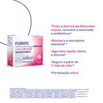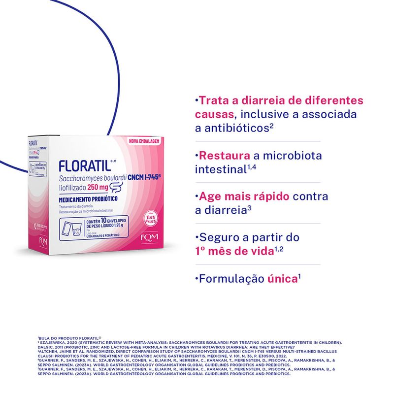 Cada envelope contém 250 mg do princípio ativo Saccharomyces boulardii liofilizado, em pó com sabor tutti frutti, facilitando a aceitação por adultos e crianças. O produto é resistente aos sucos gástricos, bile, antibióticos e quimioterápicos, atuando diretamente no intestino para inibir agentes patogênicos e estimular a flora benéfica. Floratil AT é indicado para uso oral, sem necessidade de prescrição, e deve ser conservado em temperatura ambiente, protegido da umidade.