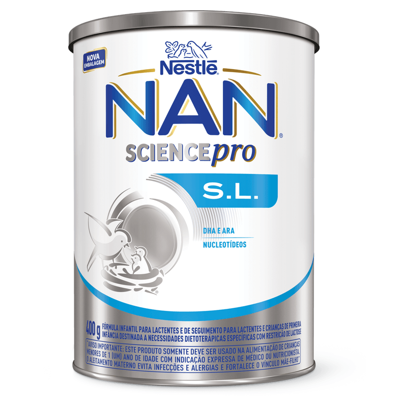 NAN S.L. é uma Fórmula Infantil para lactentes e de seguimento para lactentes destinada a necessidades dietoterápicas específicas com restrição de lactose. Com DHA, ARA e Nucleotídeos. Não contém glúten.