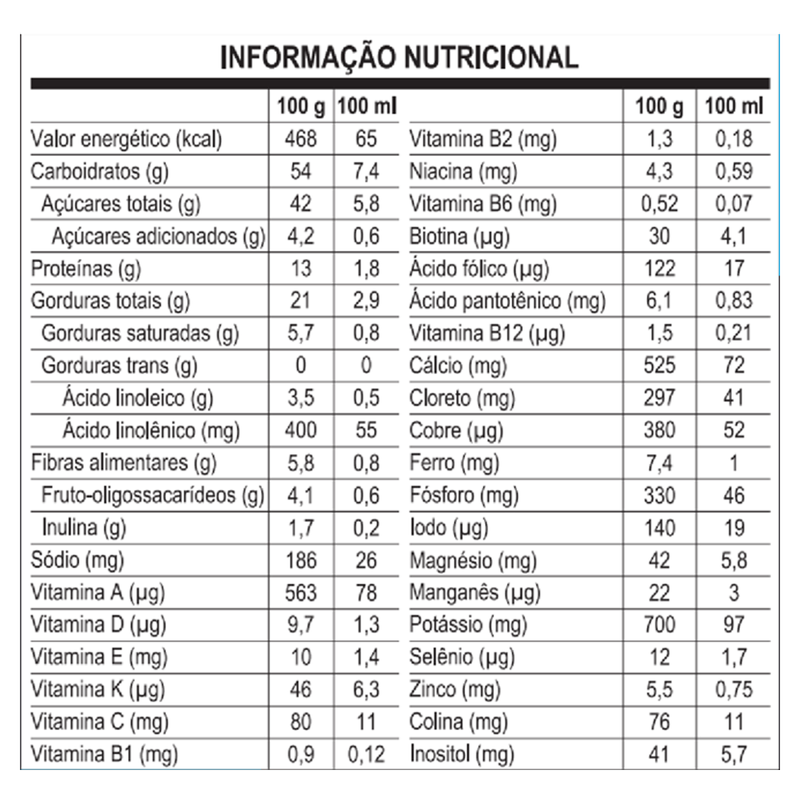 Siga rigorosamente as instruções de preparo, conservação e consumo indicadas pelo fabricante para garantir a segurança e os benefícios nutricionais do produto.