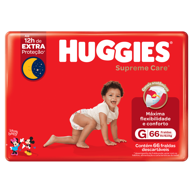 A fralda atua na proteção da pele do bebê, com alta capacidade de absorção e sistema anti-vazamento reforçado. Indicada para uso infantil, apresenta textura macia e suavidade extra na parte traseira. Embalada com 66 unidades, é prática e econômica para o dia a dia. Seu fechamento adesivo facilita a troca, enquanto a respirabilidade ajuda a manter o conforto. A embalagem destaca a proteção noturna e o cuidado especial para peles sensíveis, tornando a Huggies Supreme Care G uma escolha confiável para o cuidado diário do seu bebê.