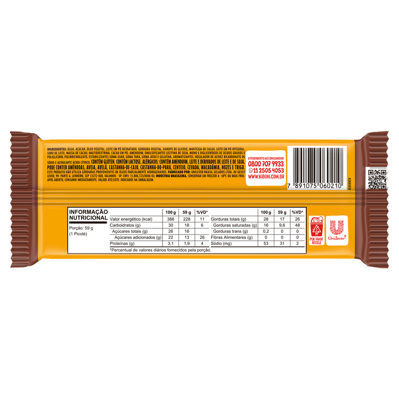 Picolé Baunilha Recheio de Chocolate Cobertura Baunilha com Crocantes de Amendoim Kibon Tablito Pacote 59g