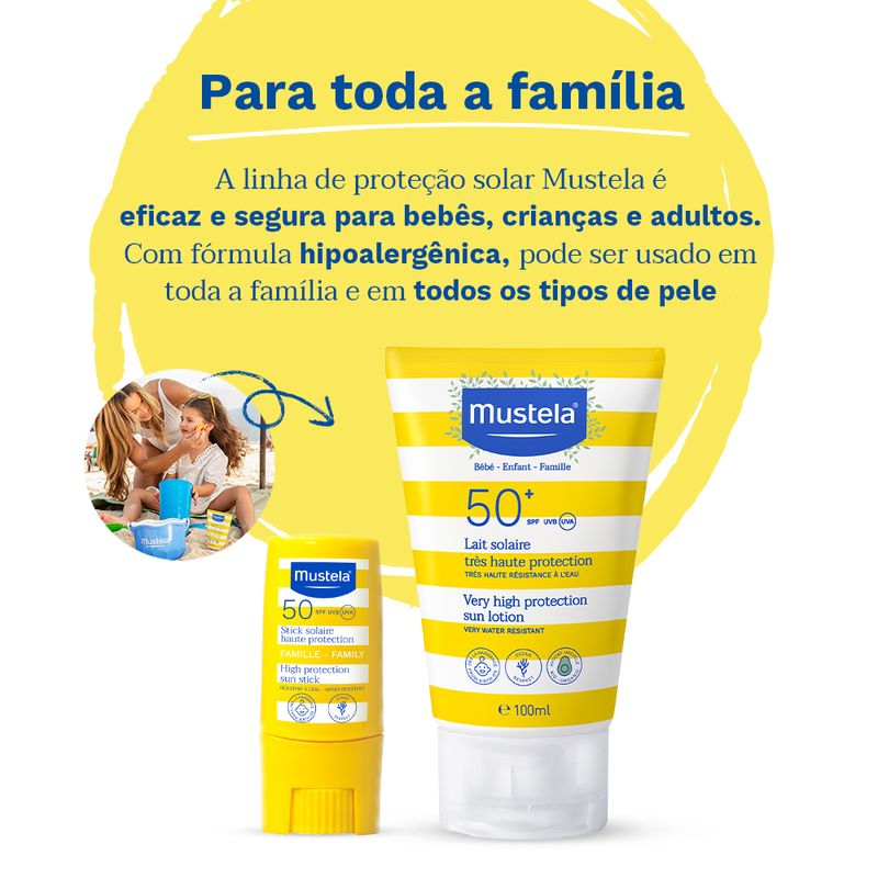 Os protetores solares Mustela possuem fotoproteção eficaz para bebês, crianças e adultos com fator FPS 50+ e fórmula Hipoalergênica adaptada para peles mais sensíveis, intolerantes ao sol e com tendência a atopia.