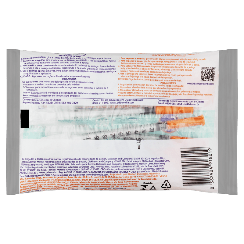 Seringa para aplicação de Insulina, de uso único, com escala graduada de 2 em 2 unidades, com agulha fixa (integrada) de 6 mm(15/64"") de comprimento x 0,25 mm (31 G) de diâmetro, sem espaço residual e com capacidade para até 100 unidades de insulina. Possui protetor de êmbolo".