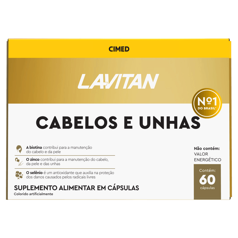 O Lavitan Suplemento Cabelos e Unhas é um suplemento vitamínico-mineral em cápsulas que combina Biotina, Zinco, Selênio, Vitamina B6 e Cromo, especialmente formulado para fortalecer cabelos e unhas, além de contribuir para a saúde da pele. Com ação antioxidante, protege as células contra os danos causados pelos radicais livres, promovendo uma aparência mais saudável e jovem. Indicado para adultos, homens e mulheres que buscam melhorar a resistência e o crescimento dos fios e unhas.