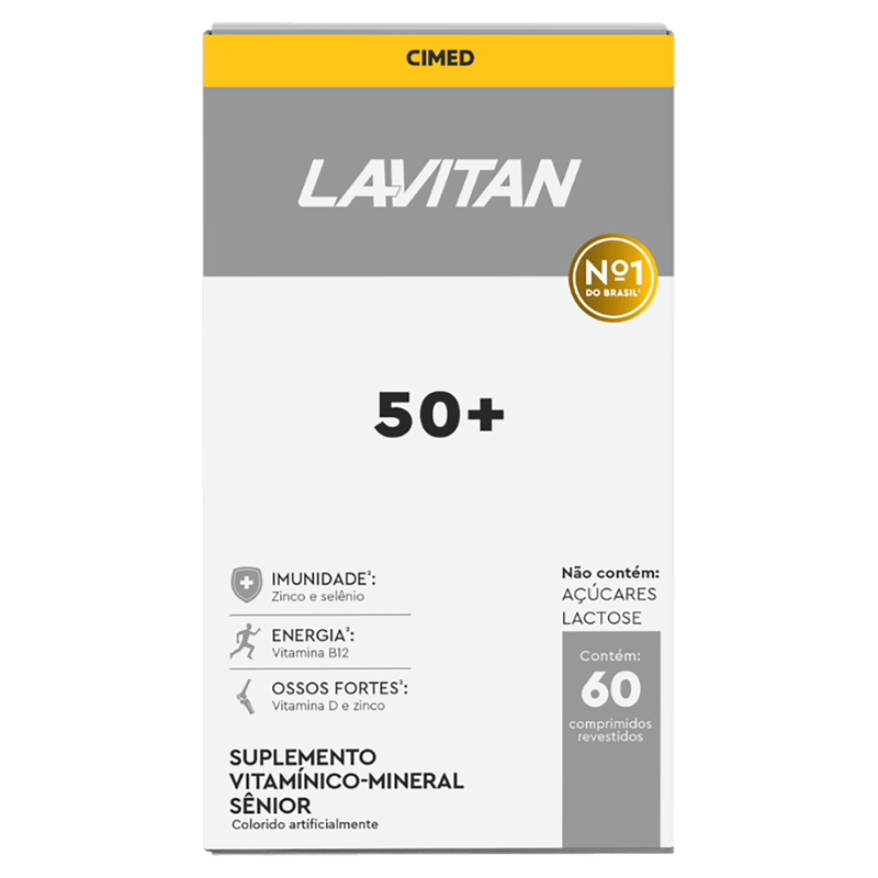 O Lavitan 50+ apresenta-se em embalagem com 60 comprimidos revestidos, sem sabor especificado, livre de açúcares, lactose e glúten, facilitando a ingestão diária. Sua fórmula atua diretamente no suporte imunológico, metabolismo energético e saúde da pele, cabelo e unhas, sendo ideal para adultos que buscam manter a vitalidade e o bem-estar na terceira idade. Produto de uso oral, sem necessidade de prescrição médica, registrado na Anvisa sob o número 802278.