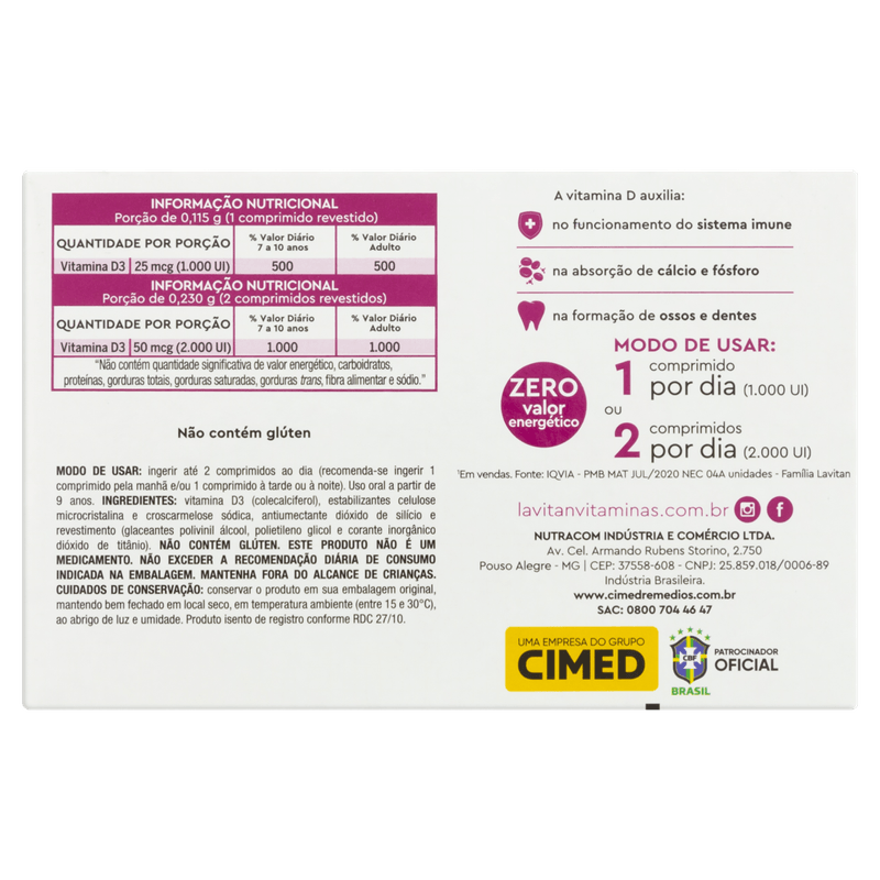 Este suplemento atua diretamente no fortalecimento do sistema imunológico e na formação saudável dos ossos e dentes, sendo indicado para quem deseja prevenir deficiências de vitamina D. Apresenta-se em embalagem com 30 comprimidos revestidos, sem sabor e de fácil administração oral. Produto sem tarja, não requer prescrição médica e pode ser utilizado durante a gravidez sob orientação profissional. Lembre-se: este produto não substitui uma alimentação equilibrada.