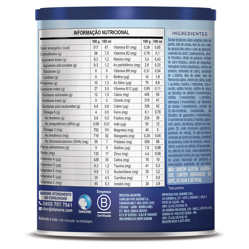 Este produto somente deve ser usado na alimentação de crianças menores de 1 ano de idade com indicação expressa de médico ou nutricionista. O aleitamento materno evita infecções e alergias e fortalece o vínculo mãe-filho. Não contém glúten. Alérgicos: contém derivados de leite, soja e peixe. Preparo, armazenamento e uso inadequados podem causar riscos à saúde do lactente.