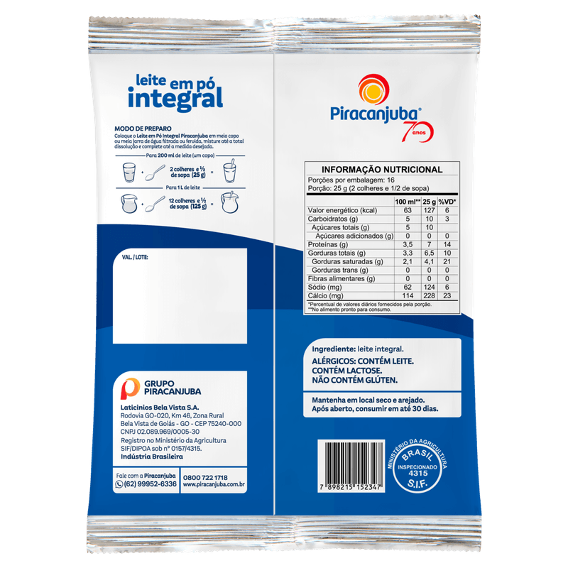 O Leite em Pó Integral Piracanjuba é um produto da categoria conveniência, apresentado em pacote de 400g, indicado para suplementação e complementação alimentar em diversas ocasiões.