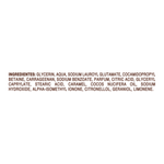 Glycerin, aqua, sodium lauroyl glutamate, cocamidopropyl betaine, carrageenan, sodium benzoate, parfum, citric acid, glyceryl caprylate, stearic acid, caramel, cocos nucifera oil, sodium hydroxide, alpha-isomethyl ionone, citronellol, geraniol, limonene.