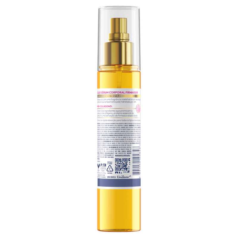 Modo de Usar: Aplique o óleo sérum corporal firmador sobre a pele limpa e seca, preferencialmente após o banho. Borrife o produto diretamente no corpo e massageie suavemente até completa absorção. Uso diário para melhores resultados.