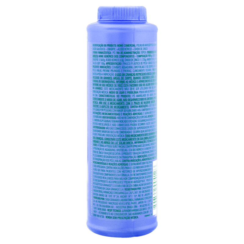 Composição: Ácido salicílico 0,352g; enxofre 17,602g; ácido bórico 3,0g; óxido de zinco 11,735g; amido 23,47g; aromatizante 1,5g; talco osp 100g.