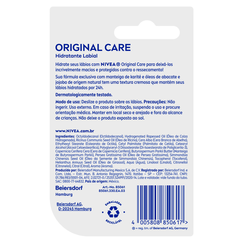 O Hidratante Labial Original Care Nivea é um bálsamo nutritivo que oferece hidratação intensa e proteção por 24 horas, mantendo os lábios macios e saudáveis. Com manteiga de Karité e óleos naturais, protege contra os efeitos do frio, vento e clima seco, garantindo conforto e cuidado contínuo.