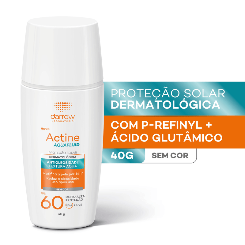 Actine Aquafluid Protetor Solar FPS 60 é uma fórmula especialmente desenvolvida para o cuidado da pele oleosa a acneica. Possui alta fotoproteção UVA/UVB, textura fluida de absorção imediata e toque seco. Seu complexo único de ativos - P-Refynil e Ácido Flutâmico - age profundamente e trata a oleosidade desde a origem. Hipoalergênico e não comedogênico. Produto não testado em animais. Actine, a linha expert em pele oleosa, mais prescrita pelos dermatologistas, possui um portfólio completo de produtos desenvolvidos especialmente para pele latina, a mantendo limpa, hidratada, protegida e sem o aspecto brilhante todos os dias.