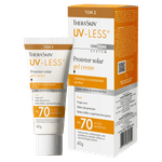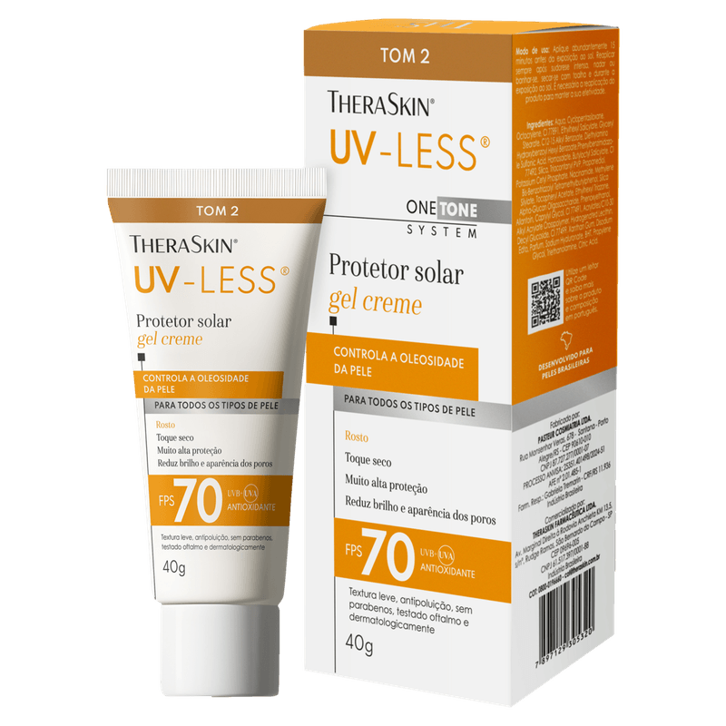 O Protetor Solar Facial Theraskin UV-Less FPS 70 Cor Tom 2 é um gel-creme de alta proteção desenvolvido para peles de tonalidade média. Com fórmula enriquecida por niacinamida, vitamina E, ácido hialurônico e alantoína, oferece hidratação, ação calmante e antioxidante, além de uniformizar o tom da pele com uma cobertura leve e natural. Sua textura leve e toque seco garantem rápida absorção, sendo resistente à água e ao suor, ideal para uso diário em todos os tipos de pele, inclusive as mais sensíveis ou em tratamento dermatológico.