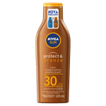 O Protetor Solar Nivea Sun Protect & Bronze FPS 30 é um protetor solar em loção com 125 ml, desenvolvido para oferecer alta proteção contra os raios UVA e UVB, prevenindo queimaduras solares e o envelhecimento precoce da pele, além de estimular um bronzeado natural e uniforme.