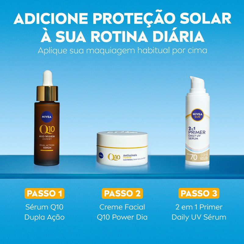 NIVEA Sun 2 em 1 Primer Daily UV Sérum FPS 70 é um protetor solar de textura leve, que oferece proteção contra os raios solares e contra os danos causados pela luz visível. Sua fórmula avançada, enriquecida com ácido hialurônico e licochalcona A, garante hidratação e ajuda a prevenir o envelhecimento precoce.