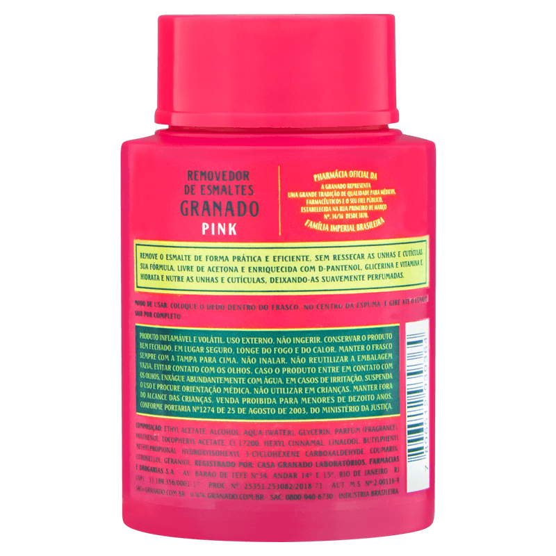 O Removedor de Esmaltes Granado Pink 75ml é livre de acetona, removendo o esmalte de forma eficaz sem agredir, ressecar ou esbranquiçar unhas e cutículas. Sua fórmula é enriquecida com vitamina E, glicerina vegetal e D-Pantenol, que hidratam e auxiliam na recuperação de unhas quebradiças e frágeis. A embalagem prática com espuma interna dispensa o uso de algodão, proporcionando uma aplicação rápida e higiênica. Além disso, é livre de conservantes, corantes e ingredientes de origem animal, alinhando-se a práticas veganas e sustentáveis.
