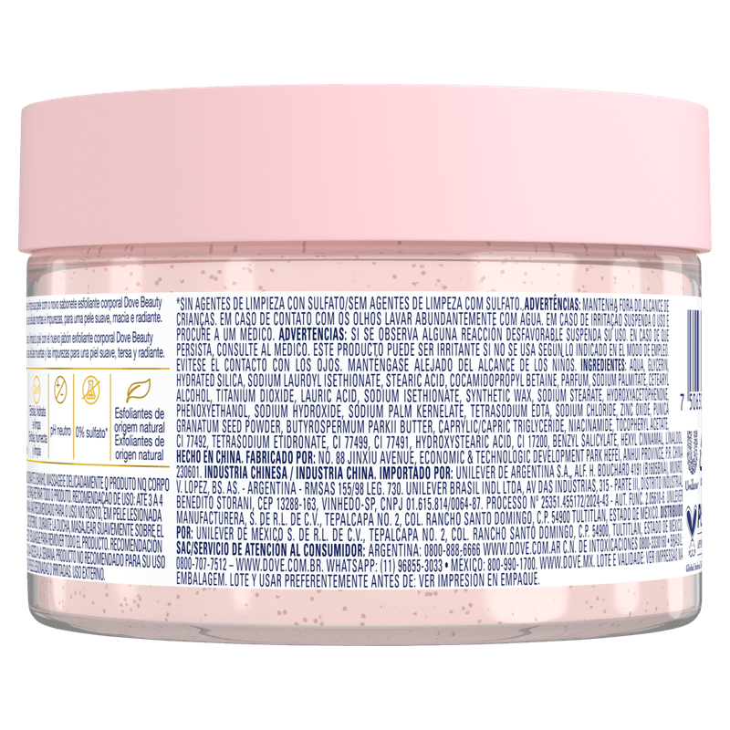 Contém pó de semente de romã, manteiga de karité, niacinamida (vitamina B3) e vitamina E (acetato de tocoferol) – ingredientes que juntos proporcionam esfoliação, nutrição e regeneração da pele.