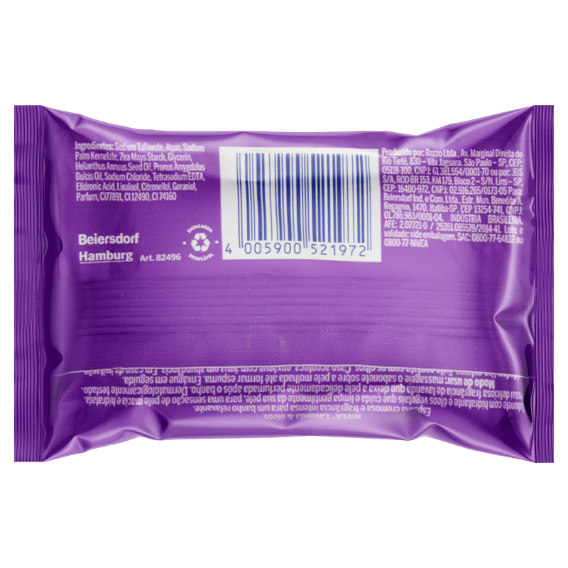 O que é? Sabonete hidratante em barra para cuidar da sua pele durante o banho. Experiência única de carinho. Garanta a sua! Para que serve o Sabonete em Barra Hidratante Lavanda & Óleos? Fórmula especial com óleos naturais e lavanda, limpa e deixa a pele com a sensação macia e hidratada. Espuma cremosa. Benefícios e diferenciais - Com hidratante - Fragrância suave de lavanda - Sabonete glicerinado - Dermatologicamente testado Como usar o Sabonete em Barra Nivea Lavanda & Óleos? Massageie suavemente na pele molhada até formar espuma. Enxágue com água em abundância. Uma unidade de embalagem contém 85g