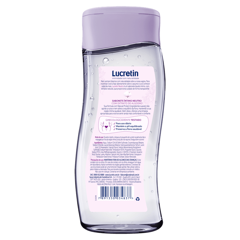 O Sabonete Líquido Íntimo Lucretin Neutro possui extrato de algodão, o que ajuda a higienizar a região íntima feminina com suavidade e delicadeza. Sua fórmula com Natural Protect mantém o equilíbrio da flora natural, sendo ideal para lavar a região intima de maneira mais apropriada que um sabonete comum. Ginecologicamente testado, esse sabonete líquido promove conforto e bem-estar corporal para a mulher.