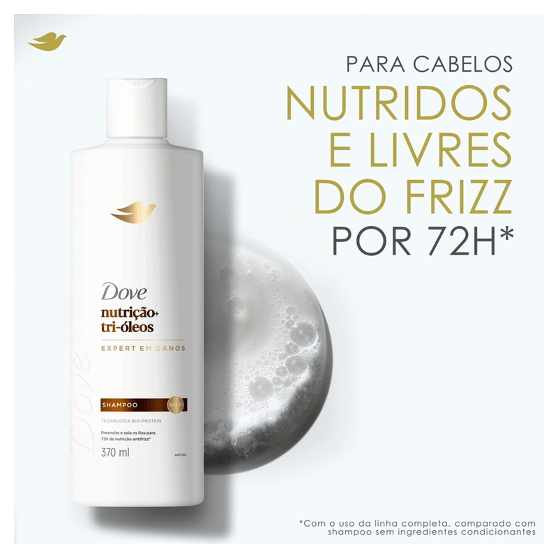 O Shampoo Dove Nutrição Tri-Óleos 370ml é ideal para todos os tipos de cabelos, oferecendo nutrição profunda e controle do frizz por até 72 horas. Sua fórmula exclusiva com Tri-Óleos Complex (óleo de argan, óleo de coco e óleo de girassol) preenche e sela os fios, enquanto a tecnologia Bio-Protein repara, regenera e protege, deixando o cabelo mais forte, macio e brilhante desde a primeira lavagem.
