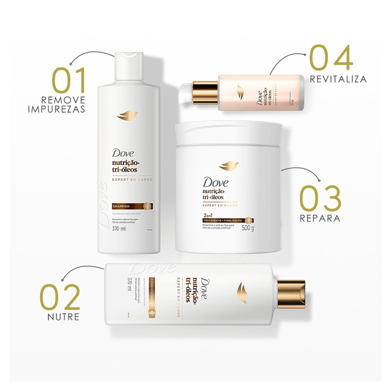Modo de usar: Massageie o shampoo nos cabelos molhados até formar espuma. Enxágue bem. Para melhores resultados, utilize toda a linha Dove Nutrição Tri-Óleos, incluindo condicionador e tratamentos.