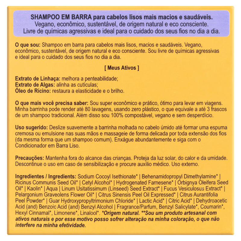 O que sou: shampoo em barra para cabelos lisos, macios e saudáveis. Vegano, econômico, sustentável, de origem natural e eco consciente. Sou livre de químicas agressivas e ideal para o cuidado dos seus fios no dia a dia.