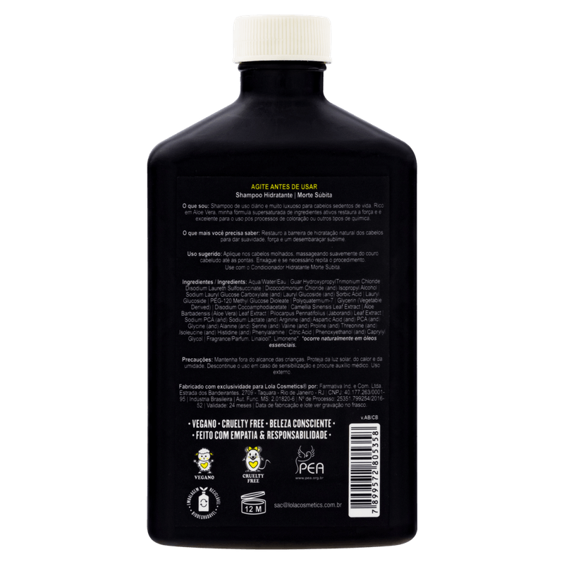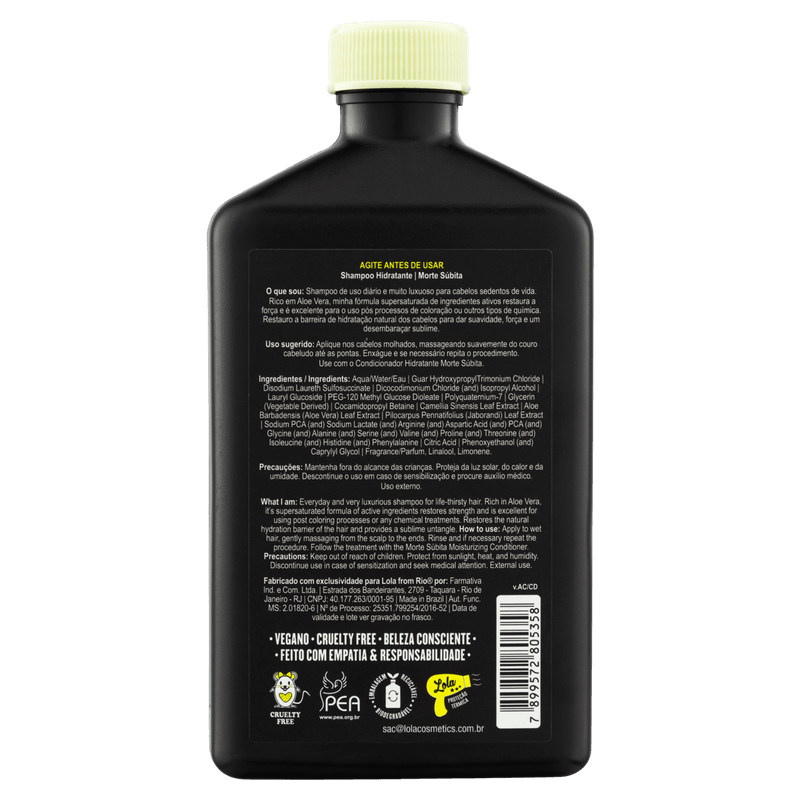 Shampoo Hidratante Lola Morte Súbita possui fórmula exclusiva com açúcar granulado, que proporciona uma esfoliação natural no couro cabeludo. É purificante, alivia coceira e ardor, hidrata e acalma o couro cabeludo sem ressecar os fios. É ideal para o uso pós tratamentos químicos e coloração.